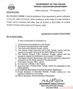 تفصیلات کے مطابق سکول ایجوکیشن ڈیپارٹمنٹ نے موسم سرما کی تعطیلات کا اعلان کرتے ہوئے نوٹیفکیشن  جاری کر دیا، اس سال شیڈول سے زیادہ چھٹیوں کا اعلان کیا گیاہے ۔ نوٹیفکیشن کے مطابق 20 دسمبر سے 5 جنوری تک پنجاب میں تمام نجی و سرکاری سکول بند رہیں گے ۔