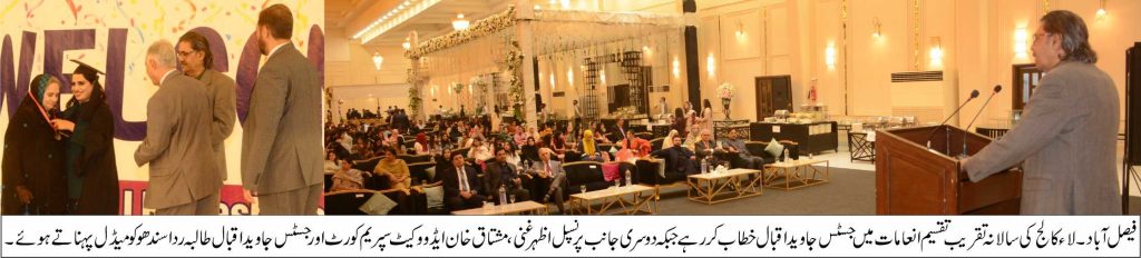 Faisalabad (94 News City Reporter)فیصل آباد لاء کالج میں سالانہ انعامات تقسیم کرنے کی شاندار تقریب کا انعقاد کیا گیا،تقریب کے مہمان خصوصی انسداد دہشت گردی عدالت کے جسٹس جاوید اقبال تھے۔ تقریب میں طلبا کی تعلیمی کارکردگی کو سراہتے ہوئے پوزیشن ہولڈرز میں میڈلز تقسیم کیے گئے۔طلباء نے اپنے فن کا خوب مظاہرہ کیا جس سے تقریب کا ماحول طلبا ء کی صلاحیتوں سے جگمگا اٹھا۔ طلباء نے مختلف قسم کے ٹیبلو، ڈرامے، نغمے اور تقاریر سے حاضرین سے خوب داد وصول کی۔ اس موقع پر ردا سندھو کو بیسٹ اکیڈمک اچیومنٹ ایوارڈ سے نوازا گیا، جس پر ہال تالیوں سے گونج اٹھا۔تقریب میں پرنسپل میجر (Retired) اظہر غنی، چیئرمین مشتاق خان ایڈووکیٹ سپریم کورٹ، ڈائریکٹر عامر یوسف ایڈووکیٹ، اور ظل عاطف کے علاوہ دیگر شخصیات نے بھی شرکت کی۔مہمانِ خصوصی جسٹس جاوید اقبال نے طلبا کی کارکردگی کو بھرپور داد دیتے ہوئے کہا کہ نوجوان ملک کا مستقبل ہیں ان کا اعتماد اور محنت ہمارے لیے باعث فخر ہے۔چیئرمین مشتاق خان نے کہاہم نہ صرف وکلاء تیار کر رہے ہیں بلکہ ان کی کردار سازی پر بھی خصوصی توجہ دے رہے ہیں، تاکہ وہ مستقبل کے لیے بہترین شہری بن سکیں۔ڈائریکٹر عامر یوسف ایڈووکیٹ نے کہا کہ قانون کے پیشے میں مہارت کے ساتھ اخلاقیات کو اپنانا کامیابی کی کنجی ہے۔ظل عاطف نے کہا نوجوانوں میں خوداعتمادی اور تخلیقی صلاحیتوں کا فروغ ہماری اولین ترجیح ہے۔تقریب میں نئے آنیوالے طلبا کو خوش آمدید کہا گیا، جہاں ان کی رہنمائی کے لیے سینئرز نے انہیں خوش دلی سے ویلکم کیا اور قانون کے شعبے میں کامیابی کے لیے اہم مشورے دیے۔