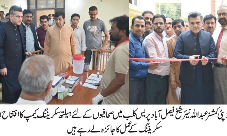 فیصل آباد پریس کلب میں دو روزہ ہیلتھ سکریننگ کیمپ کا افتتاح ڈپٹی کمشنرعبداللہ نیئر شیخ نےکردیا