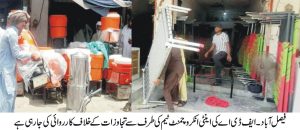تفصیلات کے مطابق اسٹیٹ آفیسر ایف ڈی اے انیب اسلم رندھاوا کی سربراہی میں ایف ڈی اے کی اینٹی انکروچمنٹ ٹیم نے فیلڈ میں انسپکشن کی تو بعض دکانداروں نے ڈجکوٹ روڈ، ارشد مارکیٹ اور حسین مارکیٹ جھنگ بازار میں عارضی و پختہ تجاوزات قائم کرکے سرکاری جگہ پر قبضہ اور عوامی گزرگاہوں کو روک رکھا تھا جن کے خلاف کارروائی کرتے ہوئے تجاوزات کا خاتمہ کرکے سامان قبضہ میں لے لیا اور قصوروار دکانداروں کے خلاف چالان سپیشل جوڈیشل مجسٹریٹ کی عدالت میں بھجوا دیئے۔ ایف ڈی اے انتظامیہ کی طر ف سے دکانداروں کو تنبیہ کی گئی ہے کہ وہ کاروباری سامان اپنی حدود میں رکھیں اور سرکاری جگہ پر تعمیرات سے گریز کریں علاوہ ازیں کاروباری سامان رکھ کر سٹرکوں و راستوں کو روکنے سے اجتناب کیاجائے بصورت دیگر تجاوزات کرنے سے باز نہ آنیوالے دکانداروں کے خلاف فوجداری مقدمات بھی درج کرائے جاسکتے ہیں۔